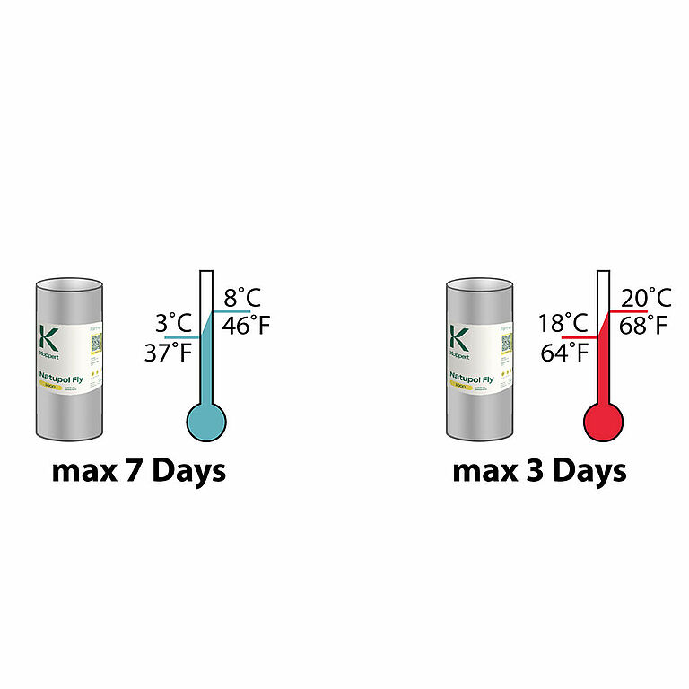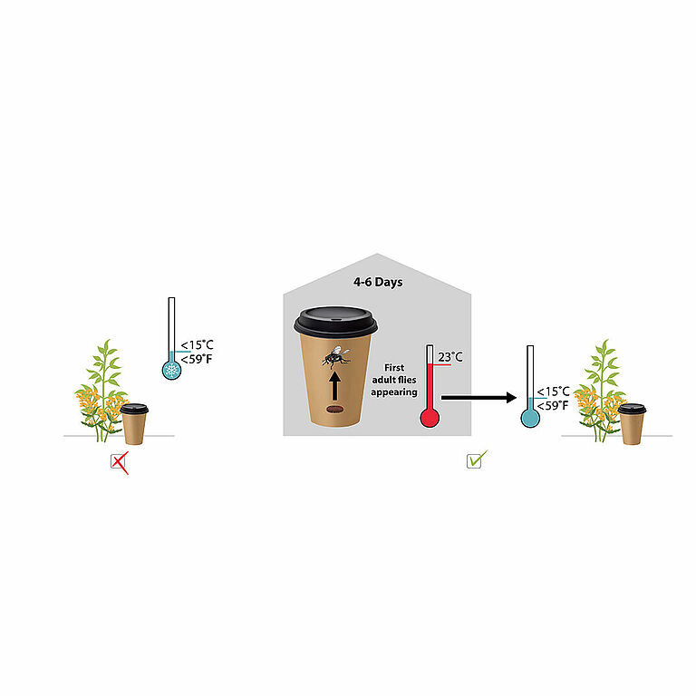 Släpp inte ut Natupol Fly utan förberedelse om temperaturen är under 15 °C. Resultatet kommer att vara oförutsägbart och tar ofta längre än en vecka. I händelse av att Natupol Fly behöver användas vid en temperatur under 15 °C, låt dem först mogna i en varm miljö. Släpp ut Natupol Fly när de första fullvuxna flugorna har utvecklats.