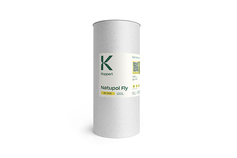 Natupol Fly är förpackad i ett papprör med plastlock. Flugpupporna blandas med sågspån för att minimera värmeproduktionen och öka fukt- och luktabsorptionen. Den ändamålsenliga förpackningsmetoden för Natupol Fly ger
