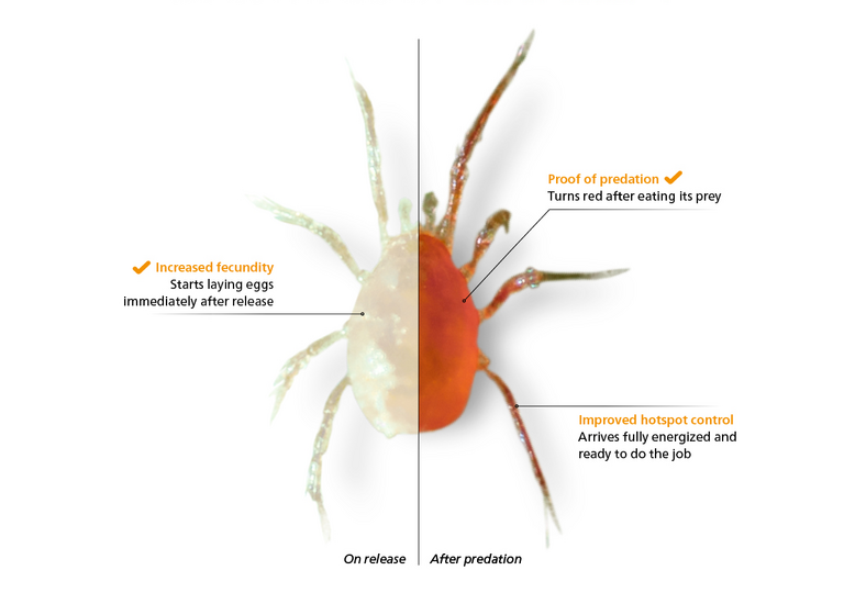 Spidex Vital rovkvalster är födda för att bekämpa spinnkvalster. Den ger dig den bästa kontrollen över hotspots, bygger populationer genom snabbare tillväxt, med ökad äggläggningskapacitet och bevis på predation. När rovkvalstret har konsumerat flera spinnkvalster, ändras färgen successivt till den karaktäristiska rödorange färgen.