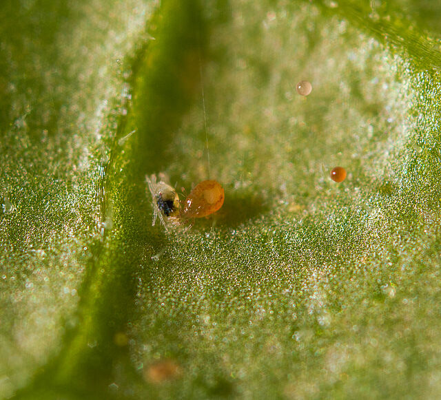 Rovkvalstret Neoseiulus californicus finns i en flaska (Spical).